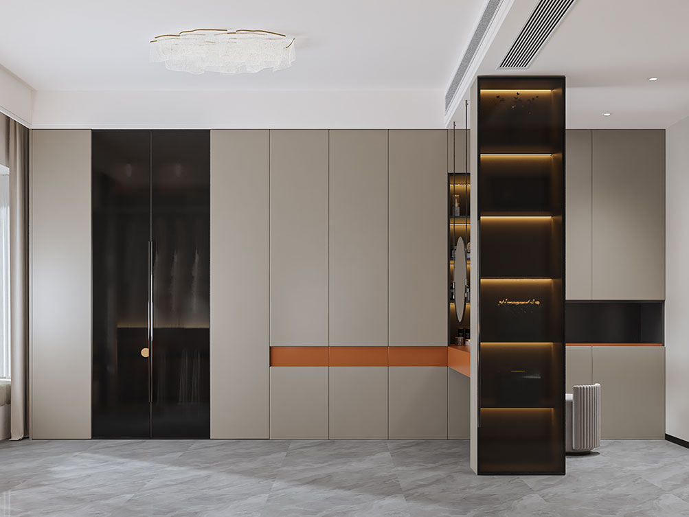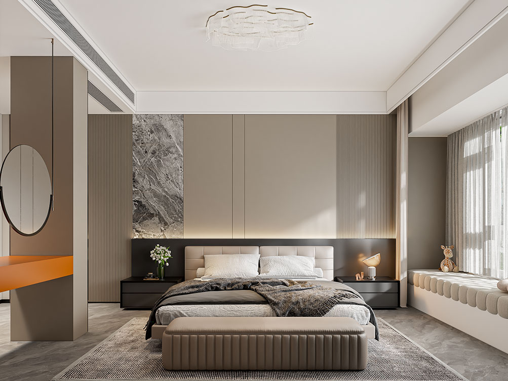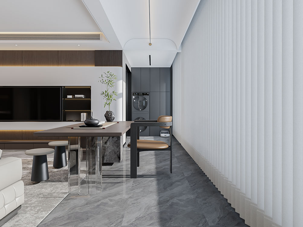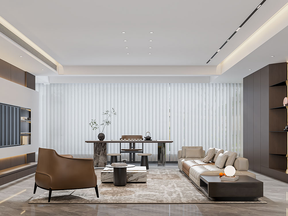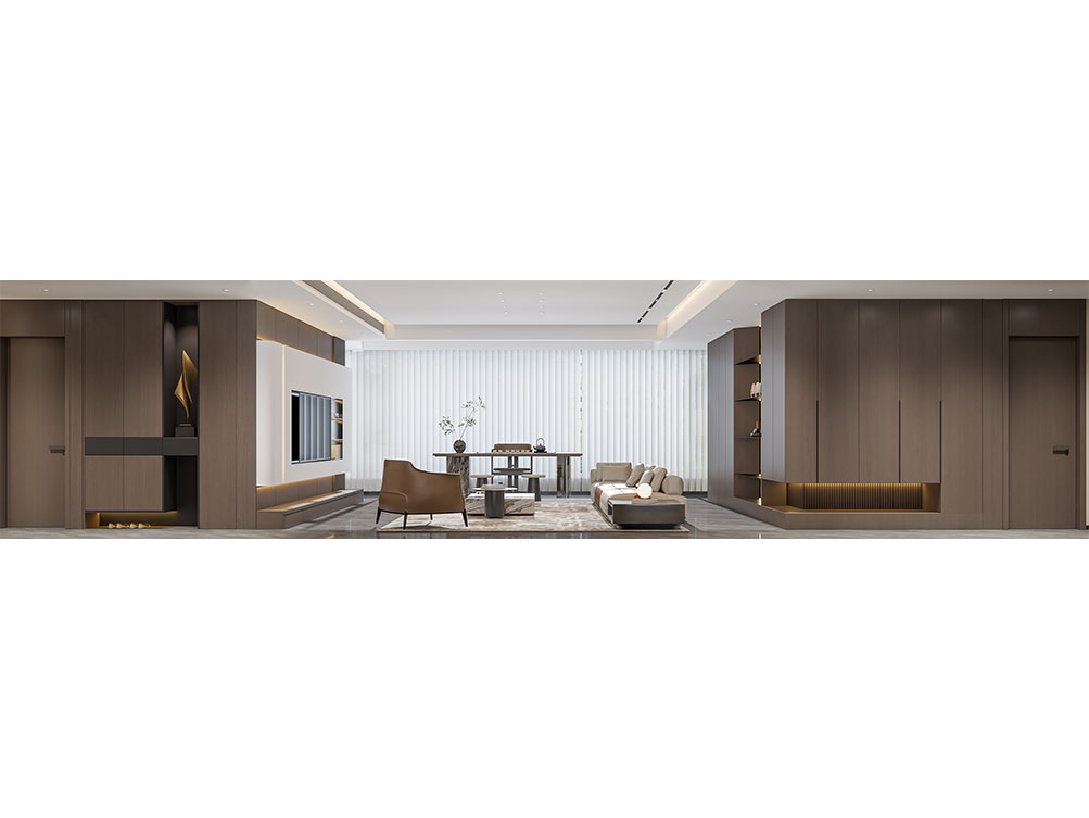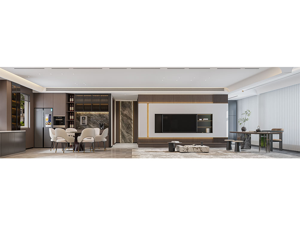 ??中電建國譽府的這套裝修,以現(xiàn)代輕奢為調(diào):淺棕沙發(fā)搭深色柜體,大理石紋理家具襯雅致地毯,無主燈設(shè)計揉入線性光,百葉窗引柔光滿室。既呼應項目鋁板幕墻的極簡美學,又用新中式擺件襯出雅致質(zhì)感,把低密社區(qū)的松弛感揉進了空間里。